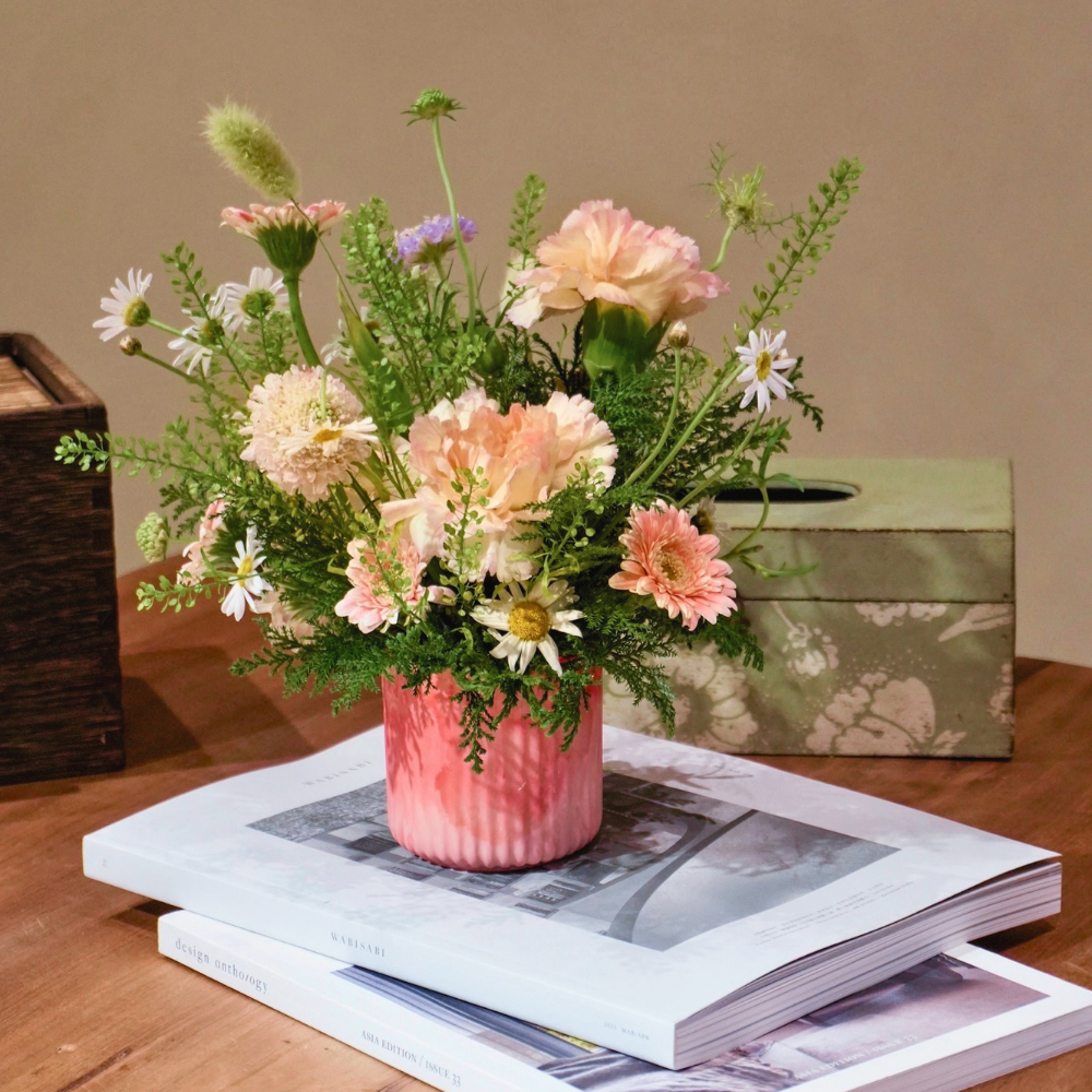 學習花材處理、基礎插花構圖技巧,讓柔美花材與礦石器皿達到視覺平衡